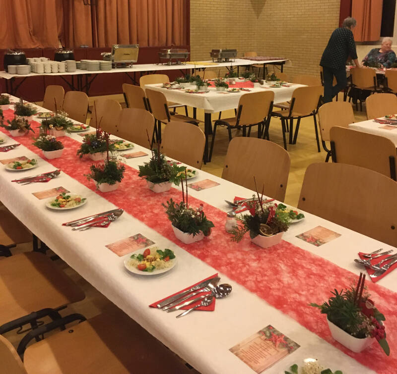 | Het kerstdiner is dit jaar op vrijdag 14 december. We proberen niet alleen extra lekker eten te maken, maar ook de aankleding van de zaal wordt feestelijk. Daarom rekenen we - net als vorig jaar - voor deze maaltijd € 7 in plaats van de gebruikelijke € 6. |