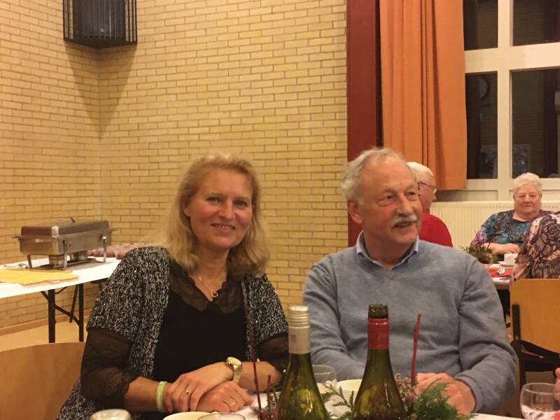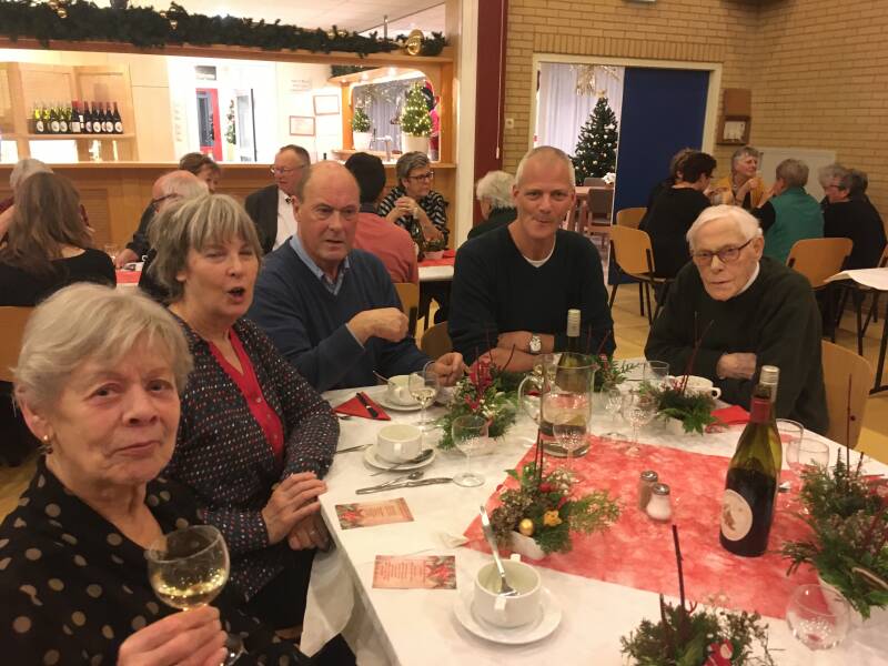 Dit was op 14 december het kerstdiner: een uitverkocht dorpshuis waar voor 80 personen (gasten + barteam + kookteam) een maaltijd werd geserveerd. Een zeer sfeervolle zaal, prachtige kerstversiering (iedereen kreeg een kerststukje mee naar huis!), veel gezelligheid en lekker eten.