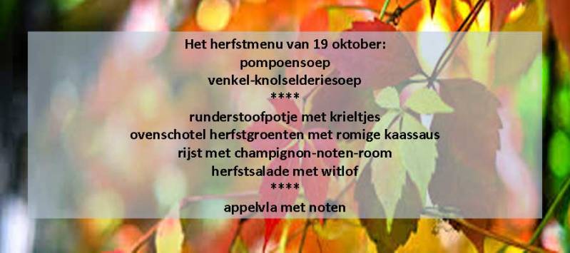 Buiten regent en stormt het, maar in het dorpshuis ruikt het heerlijk: lekkere soep waar je warm van wordt, een heerlijk stoofpotje waarvan de geur je al tegemoet komt, gerechten met paddestoelen en noten.... Laat het herfstweer maar komen!