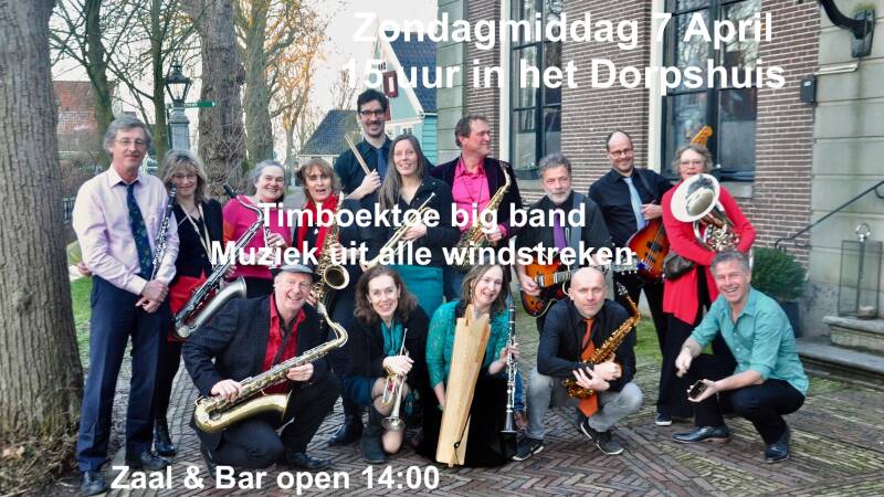 Zondagmiddag 7 april speelt de Timboektoe Bigband in de grote zaal van dorpshuis De Nesse, van 15 - 17 uur. Het dorpshuis en de zaal zijn open vanaf 14 uur. De toegang is vrij.